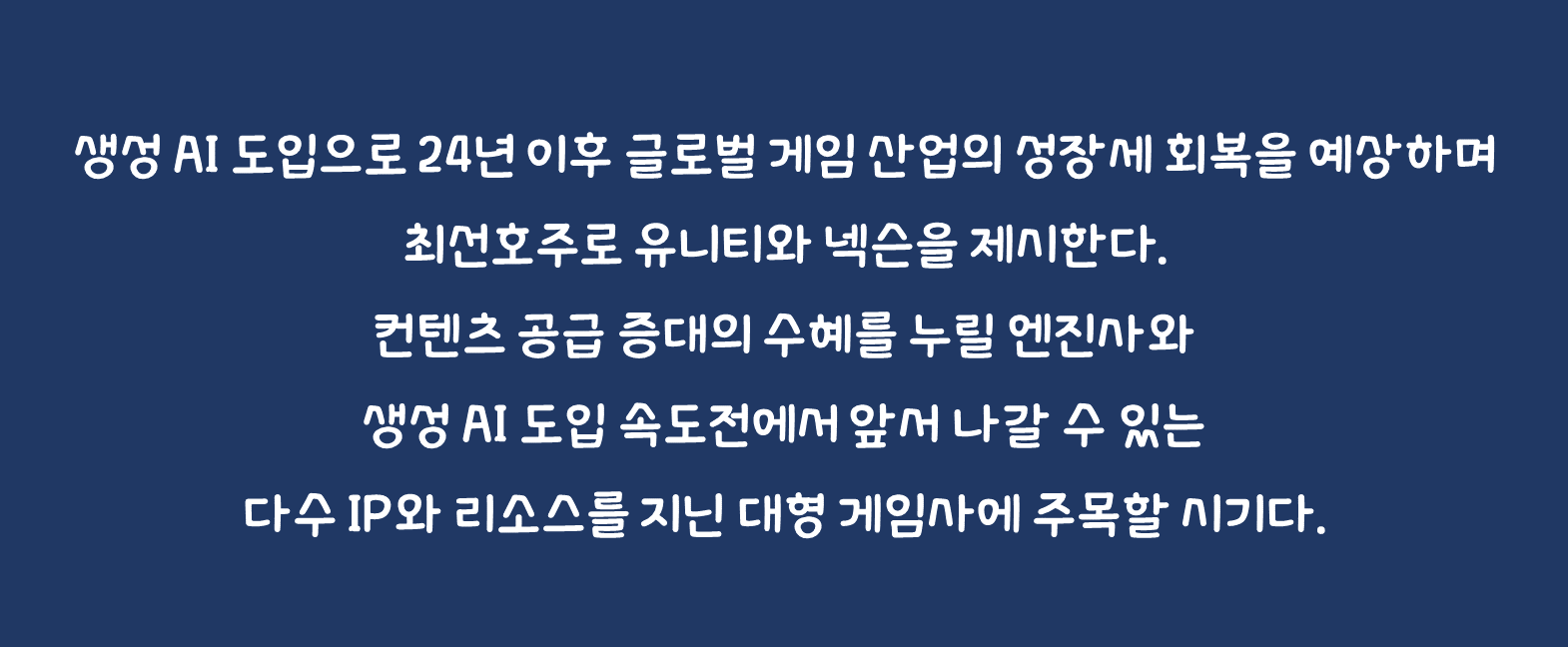 생성 AI 도입으로 24년 이후 글로벌 게임 산업의 성장세 회복을 예상하며 최선호주로 유니티와 넥슨을 제시한다. 컨텐츠 공급 증대의 수혜를 누릴 엔진사와 생성 AI 도입 속도전에서 앞서 나갈 수 있는 다수 IP와 리소스를 지닌 대형 게임사에 주목할 시기다.