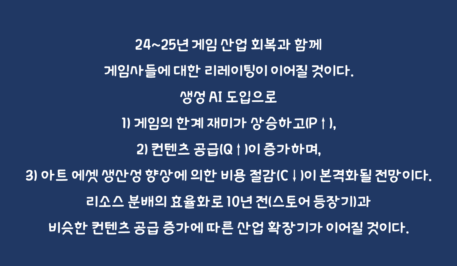 24~25년 게임 산업 회복과 함께 게임사들에 대한 리레이팅이 이어질 것이다. 생성 AI 도입으로 1) 게임의 한계 재미가 상승하고(P↑), 2) 컨텐츠 공급(Q↑)이 증가하며, 3) 아트 에셋 생산성 향상에 의한 비용 절감(C↓)이 본격화될 전망이다. 현재 생성 AI에 대한 관심이 하드웨어, 파운데이션 모델 등에 집중되어 있지만 생성 AI가 불러올 변화의 본질은 컨텐츠 생산성 증대에 있음을 상기할 필요가 있다. 리소스 분배의 효율화로 10년 전(스토어 등장기)과 비슷한 컨텐츠 공급 증가에 따른 산업 확장기가 이어질 것이다. 생성 AI 접목에 선제적인 엔진사와 게임사에 투자할 시기다.