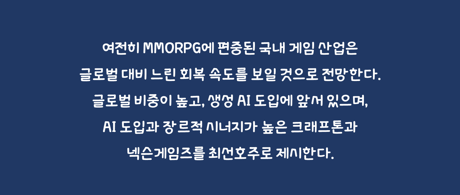 여전히 MMORPG에 편중된 국내 게임 산업은 글로벌 대비 느린 회복 속도를 보일 것으로 전망한다. 글로벌 비중이 높고, 생성 AI 도입에 앞서 있으며, AI 도입과 장르적 시너지가 높은 크래프톤과 넥슨게임즈를 최선호주로 제시한다.