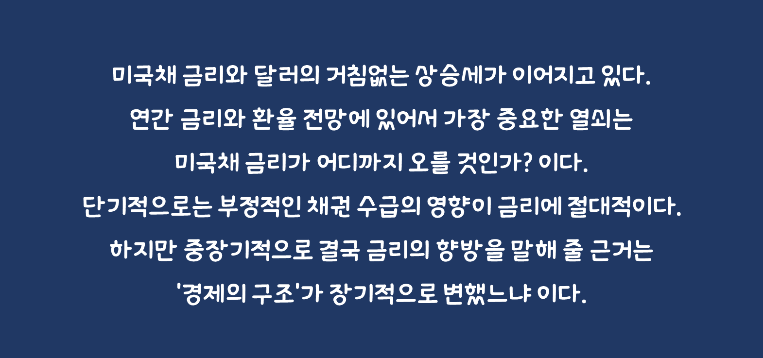 미국채 금리와 달러의 거침없는 상승세가 이어지고 있다. 연간 금리와 환율 전망에 있어서 가장 중요한 열쇠는 미국채 금리가 어디까지 오를 것인가? 이다. 단기적으로는 부정적인 채권 수급의 영향이 금리에 절대적이다. 하지만 중장기적으로 결국 금리의 향방을 말해 줄 근거는 '경제의 구조'가 장기적으로 변했느냐 이다. 경제학자들이 고민 중인 중립 금리의 변화 여부다.