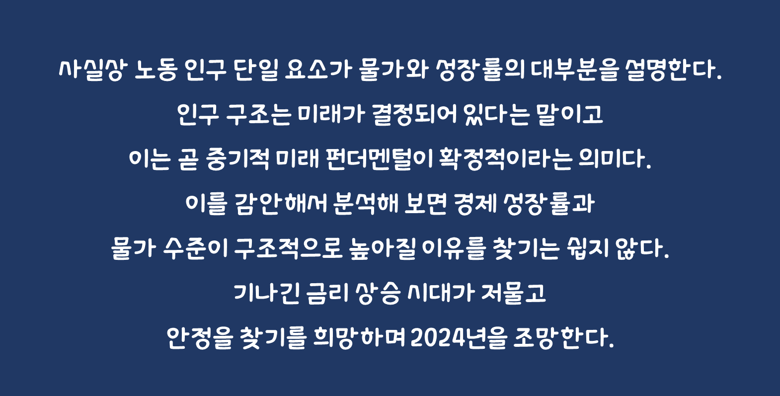 인간은 고쳐 쓰기 어렵다. 나이 들면 더 심해진다. 한 번 고착화된 버릇이 바뀌기는 그만큼 어렵다. 그런 면에서 최근 화두가 되고 있는 중립 금리의 변화라는 주제에 대해서 우리는 조심스럽지만 회의적인 시각을 가지고 있다. 과거 구조적인 경제 성장과 고물가의 원인을 다방면에서 조사하려는 시도가 있어 왔지만 다소 맥 빠지게도 사실상 노동 인구 단일 요소가 물가와 성장률의 대부분을 설명한다. 인구 구조는 미래가 결정되어 있다는 말이고 이는 곧 중기적 미래 펀더멘털이 확정적이라는 의미다.