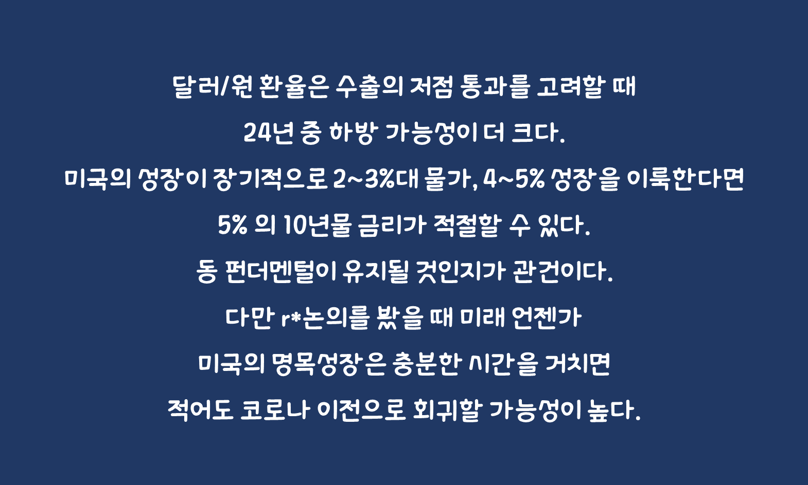 ✅ 미국의 성장이 장기적으로 2~3%대 물가, 4~5% 성장을 이룩한다면 5% 의 10년물 금리가 적절할 수 있다. 동 펀더멘털이 유지될 것인지가 관건이다. 다만 r*논의를 봤을 때 미래 언젠가 미국의 명목성장은 충분한 시간을 거치면 적어도 코로나 이전으로 회귀할 가능성이 높다.