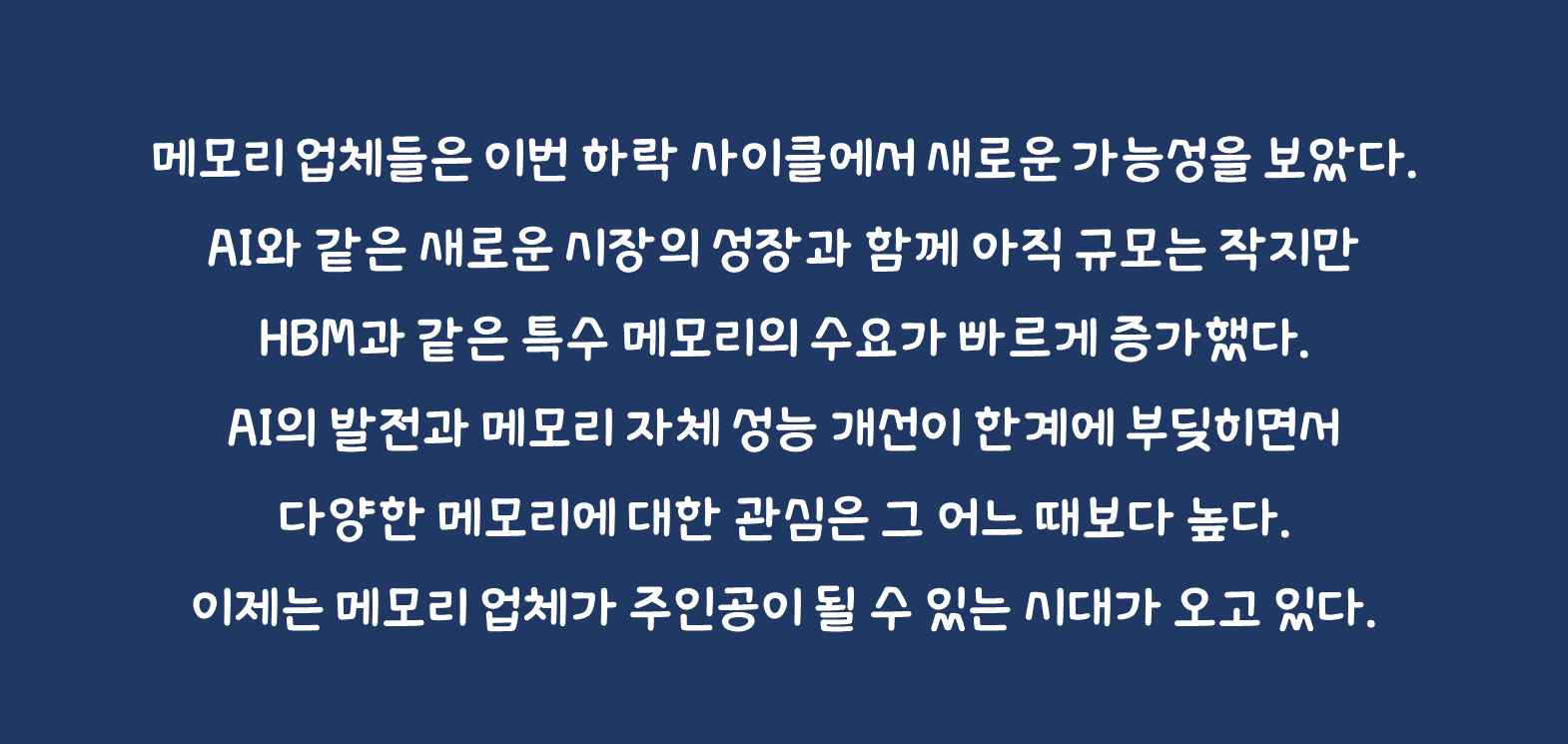 메모리 업체들은 이번 하락 사이클에서 새로운 가능성을 보았다. AI와 같은 새로운 시장의 성장과 함께 아직 규모는 작지만 HBM과 같은 특수 메모리의 수요가 빠르게 증가했다. 특수 메모리와 같은 프리미엄 제품들은 가격 하락 기간 중 ASP 안정화에 큰 기여를 한다. 실제 SK하이닉스와 삼성전자의 DRAM 사업부 추이만 살펴봐도 이를 확인할 수 있다. 물론 SK 하이닉스의 ASP 성장에는 HBM 효과뿐만 아니라, DDR5의 영향도 존재하지만 다운사이클에서 확실히 긍정적인 효과가 있었다. DRAM 산업의 매출액 방향성은 가격이 결정한다. 프리미엄 제품을 통한 가격 안정화는 가격 변동성 축소로 이어질 것이며 이는 높은 변동성에 따른 DRAM 산업의 디스카운트 요인 해소에 긍정적으로 작용할 것이다. 아직까지 특수 메모리의 개별 시장 규모는 작다. 하지만 AI의 발전과 메모리 자체 성능 개선이 한계에 부딪히면서 다양한 메모리에 대한 관심은 그 어느 때보다 높다. 이제는 메모리 업체가 주인공이 될 수 있는 시대가 오고 있다.