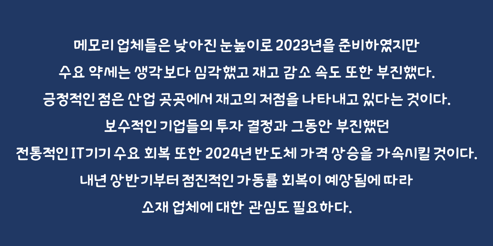 메모리 업체들은 낮아진 눈높이로 2023년을 준비하였지만 수요 약세는 생각보다 심각했고 재고 감소 속도 또한 부진했다. DRAM 가격은 2022년 고점에서 60% 이상 하락했다. 결국 2008년, 2019년 등 몇 번의 하락 사이클처럼 메모리 업체들은 공급 축소를 결정했다. 감산과 테크 마이그레이션 등에 따라 공급이 감소되며 최근 메모리 가격 반등이 나오고 있다. 지속적으로 하향 조정되던 전망치도 10월 들어 안정화되고 있다. 하지만 지속 가능한 가격 상승을 위해서는 일정 수준 이상의 수요 회복이 분명 필요하다고 판단된다. 긍정적인 점은 산업 곳곳에서 재고의 저점을 나타내고 있다는 것이다. 보수적인 기업들의 투자 결정과 그동안 부진했던 전통적인 IT기기 수요 회복 또한 2024년 반도체 가격 상승을 가속시킬 것이다. 내년 상반기부터 점진적인 가동률 회복이 예상됨에 따라 소재 업체에 대한 관심도 필요하다.