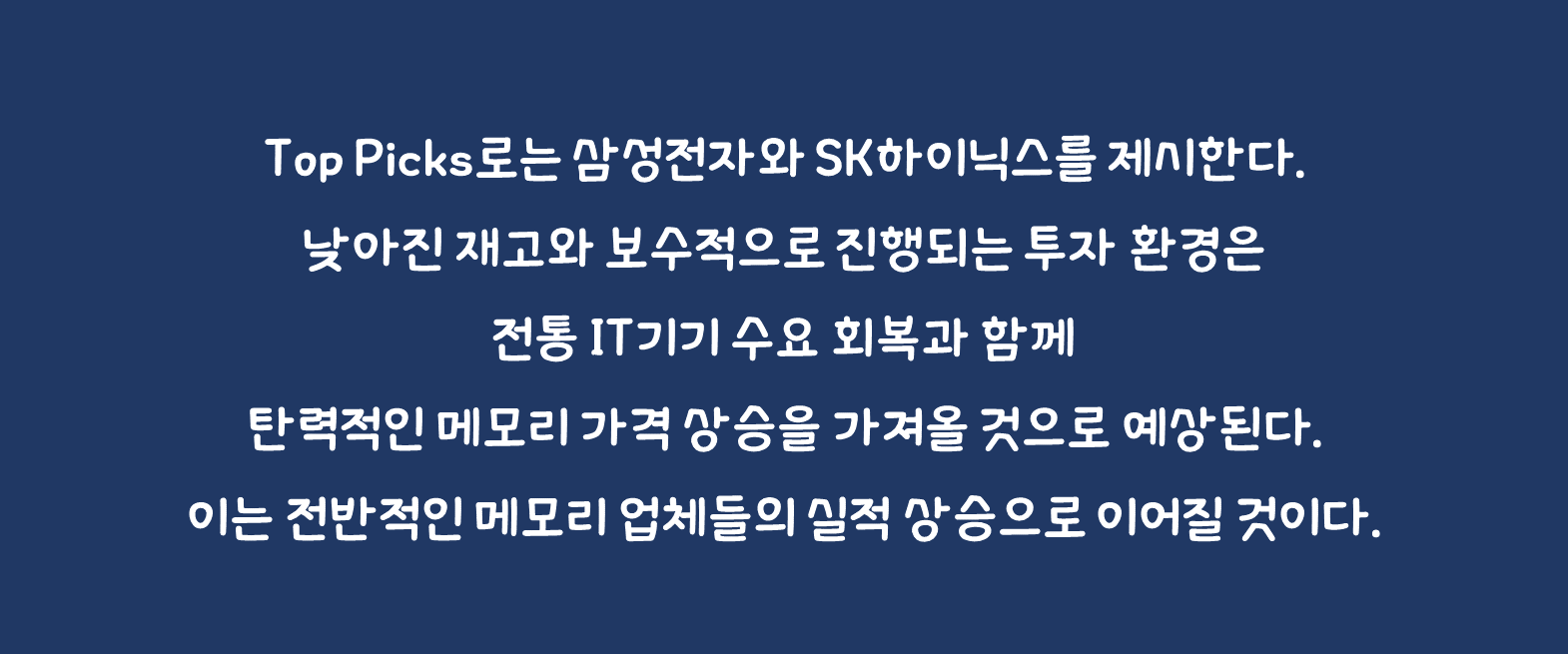 Top Picks로는 삼성전자와 SK하이닉스를 제시한다. SK하이닉스는 DDR5, HBM 등으로 흑자전환이 상대적으로 빠르게 진행되며 2024년에도 HBM 경쟁력을 유지할 것으로 예상된다. 삼성전자는 SK하이닉스 대비 HBM, DDR5 대응이 늦어 상대적으로 주가 상승률은 낮은 상황이다. 하지만 낮아진 재고와 보수적으로 진행되는 투자 환경은 전통 IT기기 수요 회복과 함께 탄력적인 메모리 가격 상승을 가져올 것으로 예상된다. 이는 전반적인 메모리 업체들의 실적 상승으로 이어질 것이다.